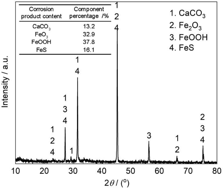 | 图7 N80钢在SRB溶液中腐蚀14 d后的XRD谱和腐蚀产物的含量 |