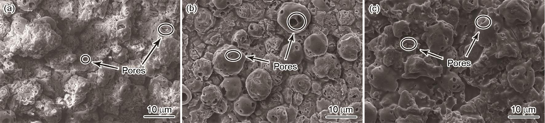 | Fig.3 SEM images of SiCP/6092 aluminum matrix composite micro-arc oxide film with different volume fraction of SiC (a) 0%, (b) 17%, (c) 30% |