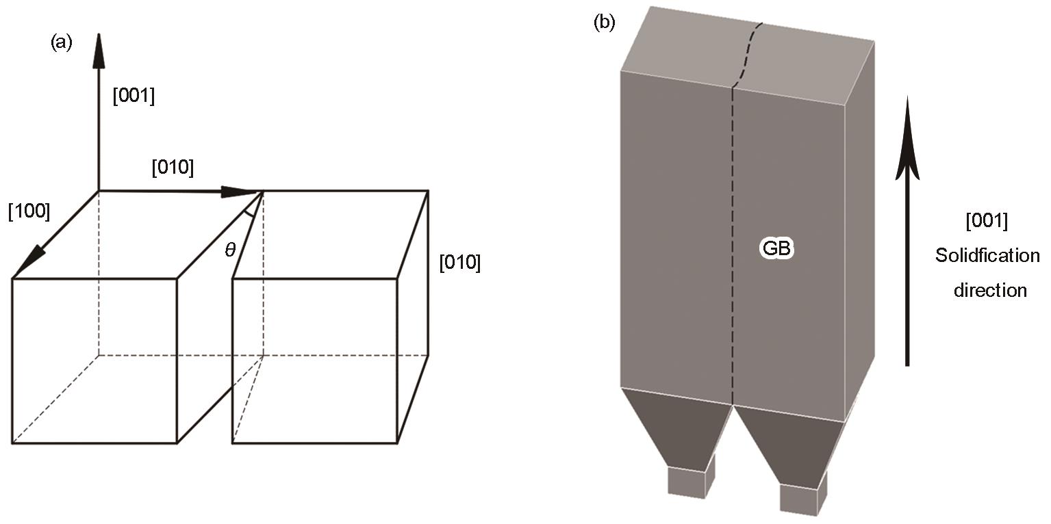 Fig.1 Schematic diagram of two crystal seeds method (a) orientations of seeds crystals, (b) directional solidification |
