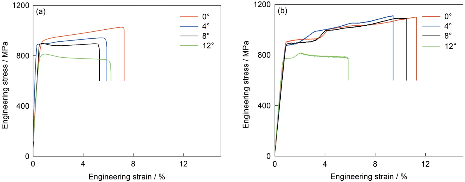 Fig.6 Tensile engineering stress-strain curves of tensile test of bicrystal samples with different misorientations tested at (a) ambient temperature, (b) 760 oC |