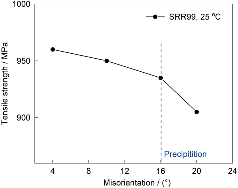 Fig.10 Tensile strength vs. the GB misorientation for SRR99 at ambient temperature[ |