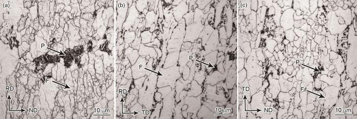 Microstructure images of X65 pipeline steel in different directions (a) RD-ND plane; (b) RD-TD plane; (c) TD-ND plane (P—pearlite; F—ferrite)