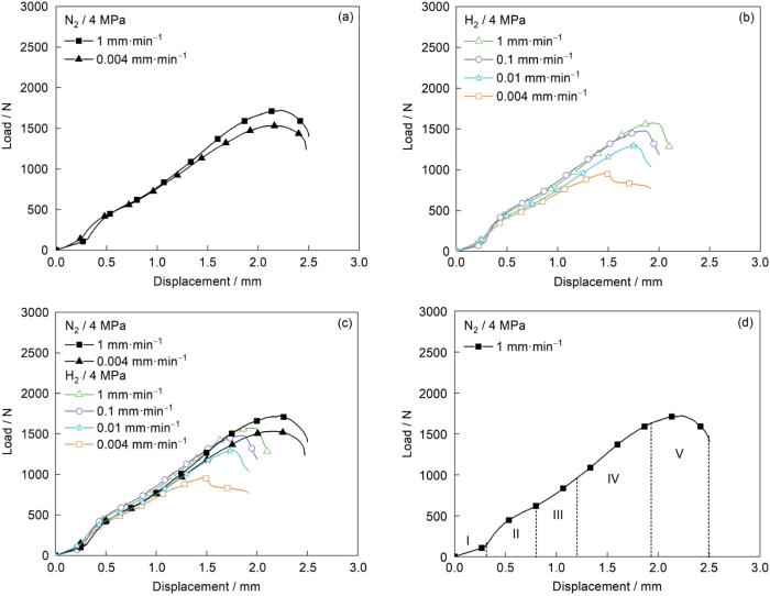 Load-displacement curves under different compression rates in nitrogen environment at 4 MPa (a); load-displacement curves under different compression rates in hydrogen environment at 4 MPa (b); load-displacement curves under different gas environments and compression rates (c) and load-displacement curve partition map under a compression rate of 1 mm·min-1 in nitrogen environment at 4 MPa (d)