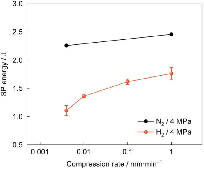 应变速率显著影响金属材料的氢脆行为,且主要通过位错运动影响材料的氢脆行为。de Almeida等[23]的小冲头实验结果表明,随着压缩速率的降低42CrMo4-700钢的氢脆敏感性提高;Han等[24]认为,氢决定了材料中可移动位错的密度进而影响材料的氢脆敏感性。为了研究材料内部位错运动对氢运动的影响,齐晓琳[25]等比较了高锰TWIP钢预充氢后不同应变速率的拉伸曲线和断口形貌,并结合理论计算发现,这种钢的氢脆敏感性随着应变速率的降低而显著提高;K.Wada等[26]在高压气态氢环境中进行工业级纯镍(NI-201)在不同温度和应变速率下的拉伸测试,发现在100 MPa的氢气环境中纯镍的氢脆敏感性受应变率和测试温度的共同影响。也有研究人员认为,应变速率只在一定范围内影响材料的氢脆行为[27]。本文在4 MPa氮气和氢气环境中进行X65管线钢的原位小冲头实验,研究压缩速率对其氢脆敏感性的影响。
