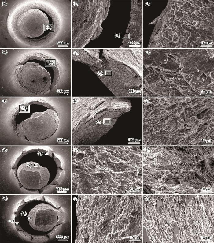 SEM images of fractured specimens under different conditions (a1~c1) 4 MPa nitrogen, compression rate of 1 mm·min-1; (a2~c2) 4 MPa hydrogen, compression rate of 1 mm·min-1; (a3~c3) 4 MPa hydrogen, compression rate of 0.1 mm·min-1; (a4~c4) 4 MPa hydrogen, compression rate of 0.01 mm·min-1; (a5~c5) 4 MPa hydrogen, compression rate of 0.004 mm·min-1