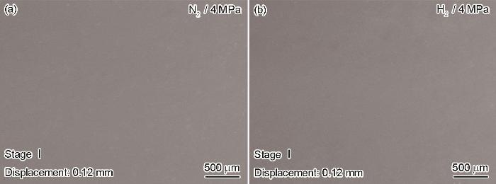 SEM images of specimen surface in compression stage Ⅰ in nitrogen environment (a) and hydrogen environment (b) at 4 MPa