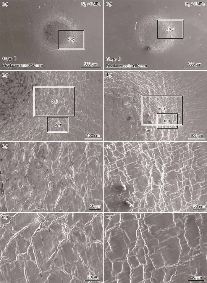 SEM images of specimen surface in compression stage Ⅱ in nitrogen environment (a1~d1) and hydrogen environment (a2~d2) at 4 MPa