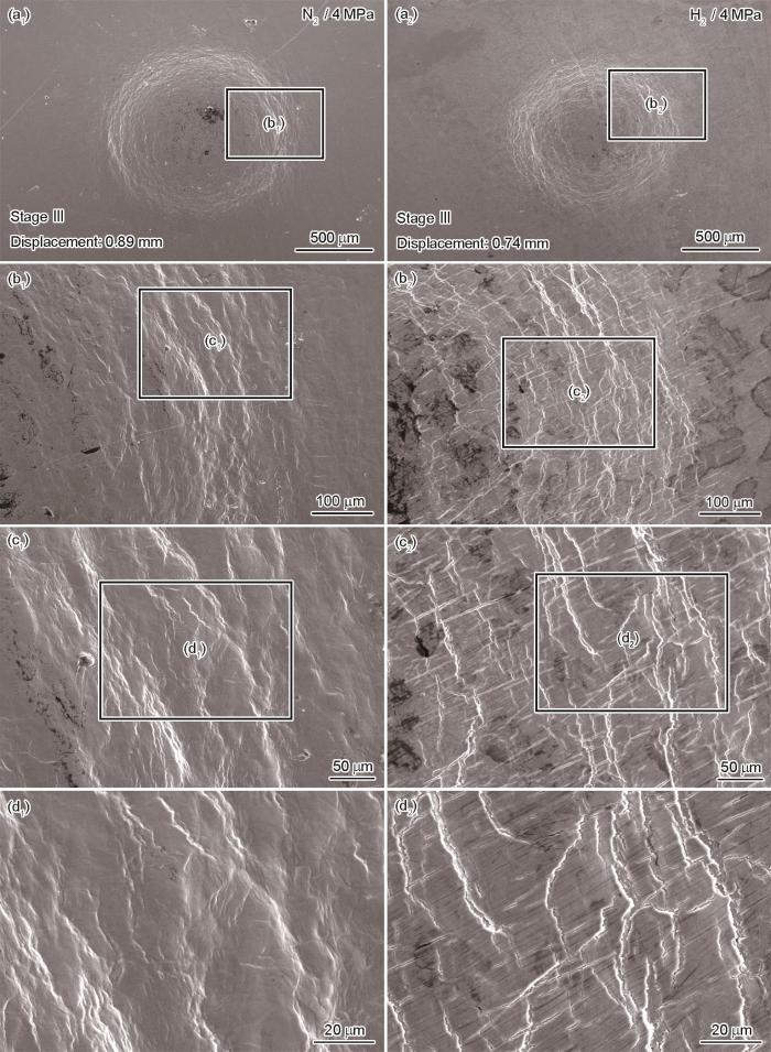 SEM images of specimen surface in compression stage Ⅲ in nitrogen environment (a1~d1) and hydrogen environment (a2~d2) at 4 MPa