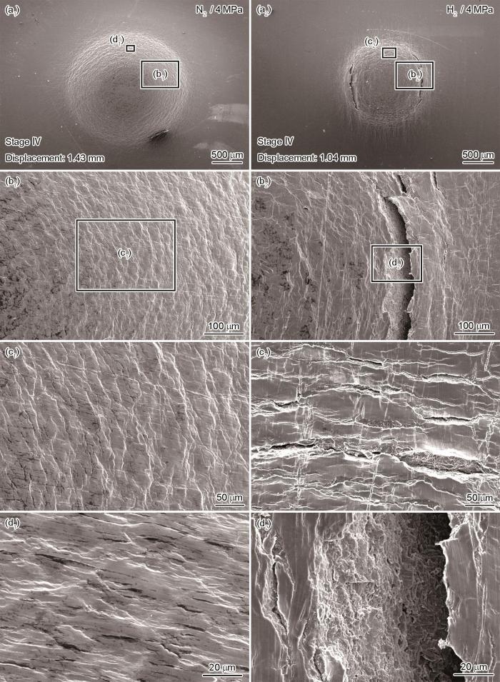 SEM images of specimen surface in compression stage IV in nitrogen environment (a1~d1) and hydrogen environment (a2~d2) at 4 MPa