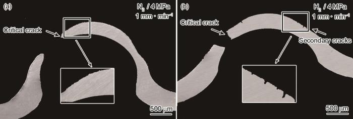 Cross-sectional diagram of specimen fracture under a compression rate of 1 mm·min-1 in nitrogen environment (a) and hydrogen environment (b) at 4 MPa