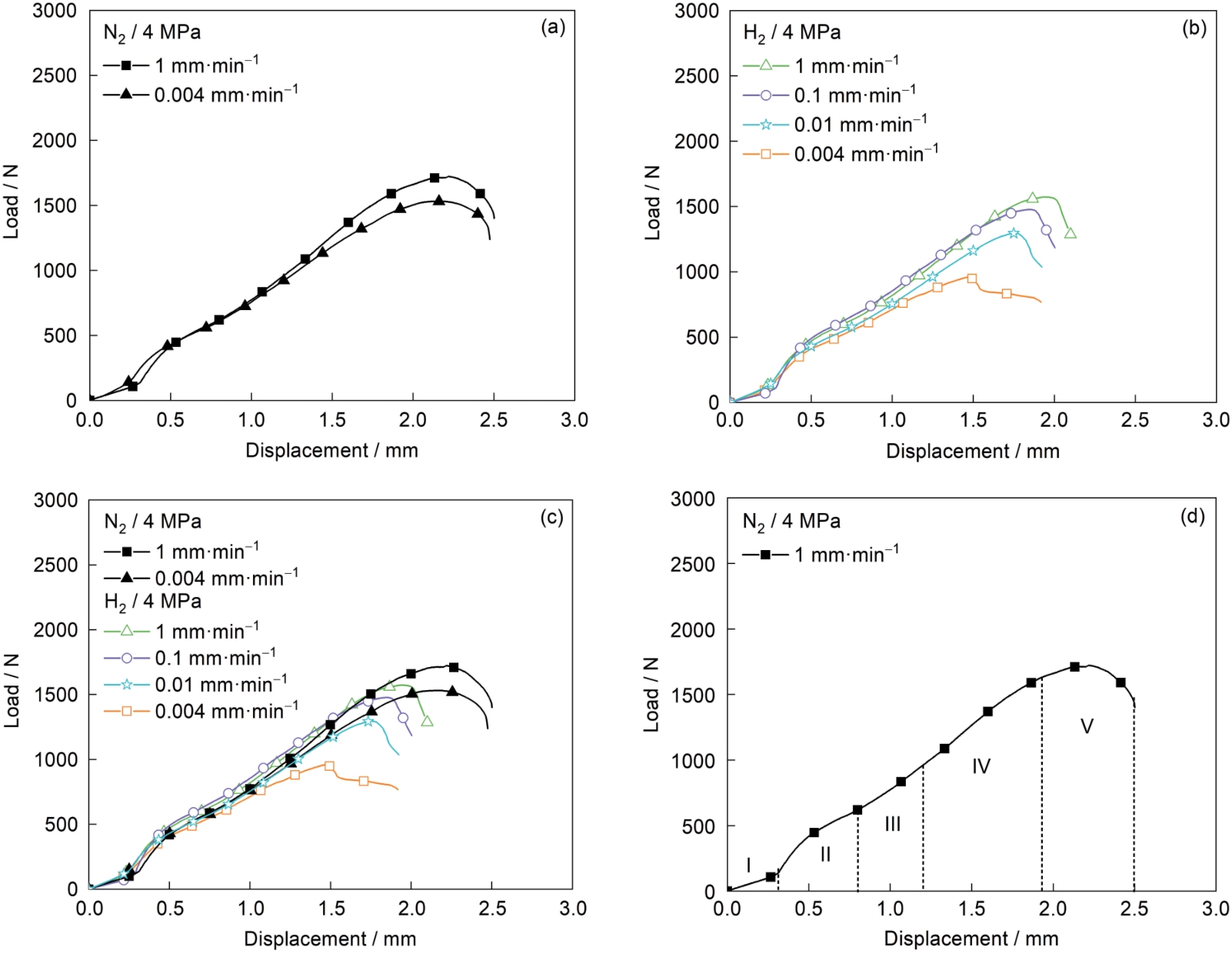 图4 在4 MPa氮气及氢气环境中不同压缩速率下的载荷-位移曲线、在不同气体环境中不同压缩速率的载荷-位移曲线以及在4 MPa氮气环境中压缩速率为1 mm·min-1的载荷-位移曲线分区图 |