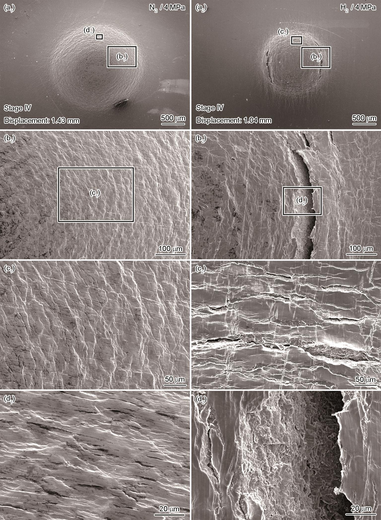 图10 在4 MPa的氮气及氢气环境中第IV压缩阶段试样表面的SEM照片 |