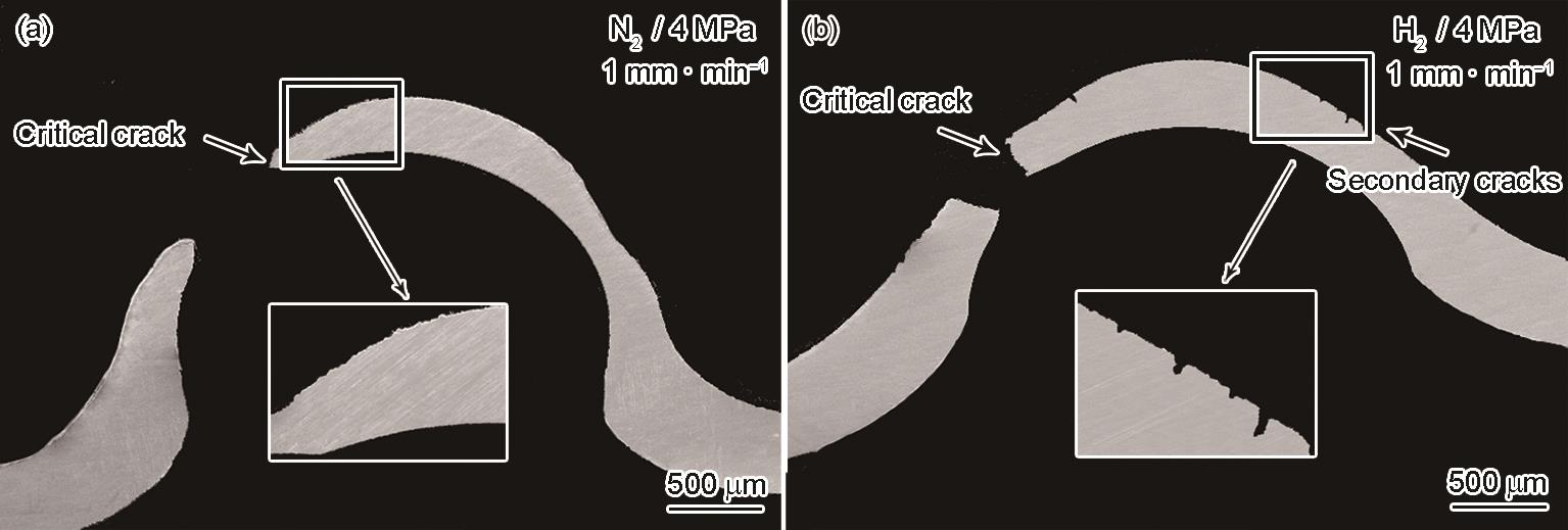Fig.11 Cross-sectional diagram of specimen fracture under a compression rate of 1 mm·min-1 in nitrogen environment (a) and hydrogen environment (b) at 4 MPa |