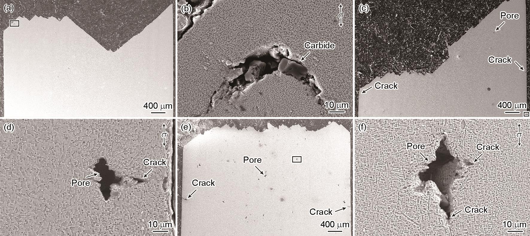 | Fig.7 Longitudinal sections of specimens treated by different thermal processes after creep under condition of 760 oC/790 MPa (a, b) HIP; (c, d) coating thermal process; (e, f) brazing thermal process |