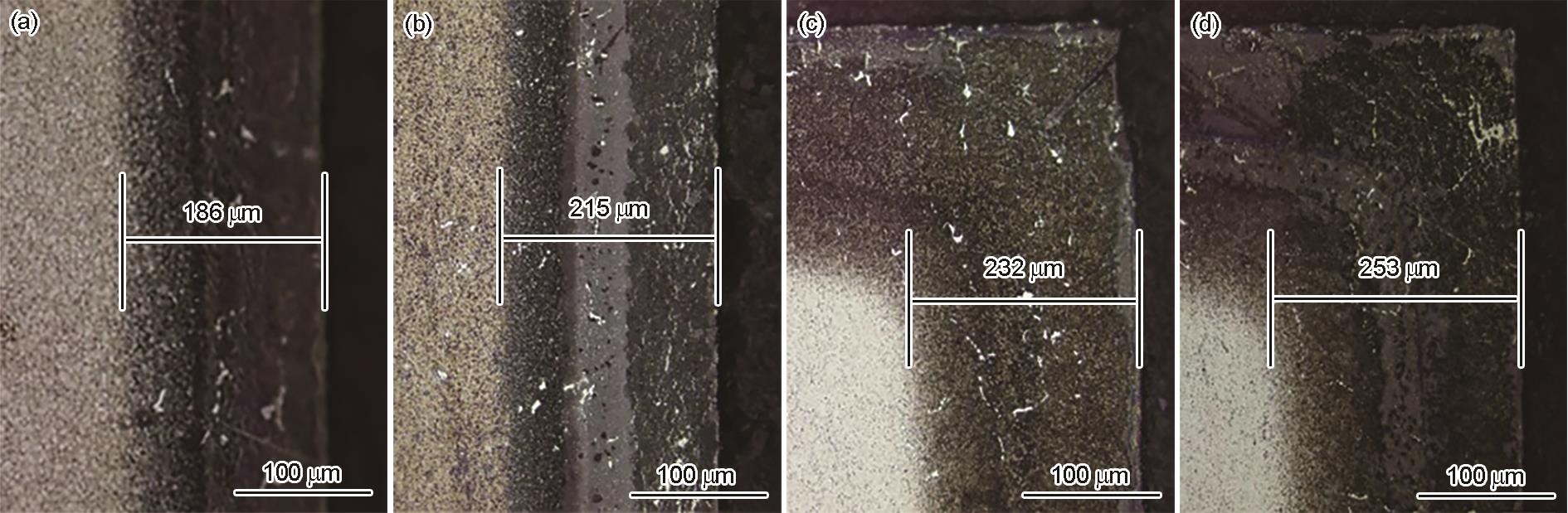 | Fig.2 Optical microscope images of 7Cr7Mo2V2Si steel after plasma nitriding at 520 oC for 24 h and diffusion at 550 oC for different time (a) without diffusion treatment; (b) diffusion for 10 h; (c) diffusion for 20 h; (d) diffusion for 30 h |