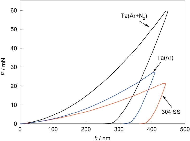 | Fig.3 Load-displacement (P-h) relationship of the Ta(Ar) and Ta(Ar+N2) coatings and the 304 stainless steel substrate (304SS) |
