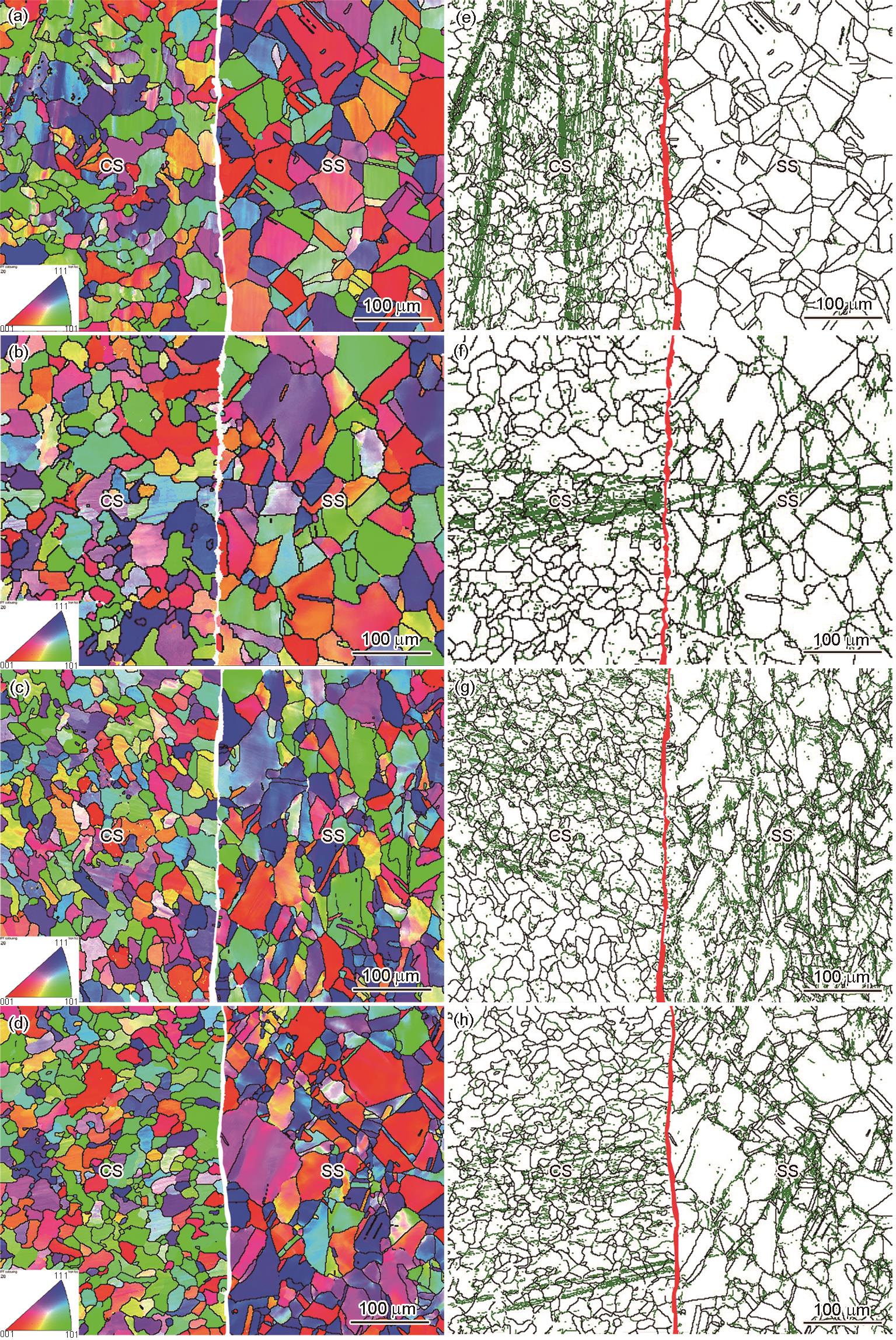 | Fig.4 IPF diagram and grain boundary diagram of composite plate interface (a, e) 30%/10%, (b, f) 30%/20%, (c, g) 30%/25%, (d, h) 35%/25% |