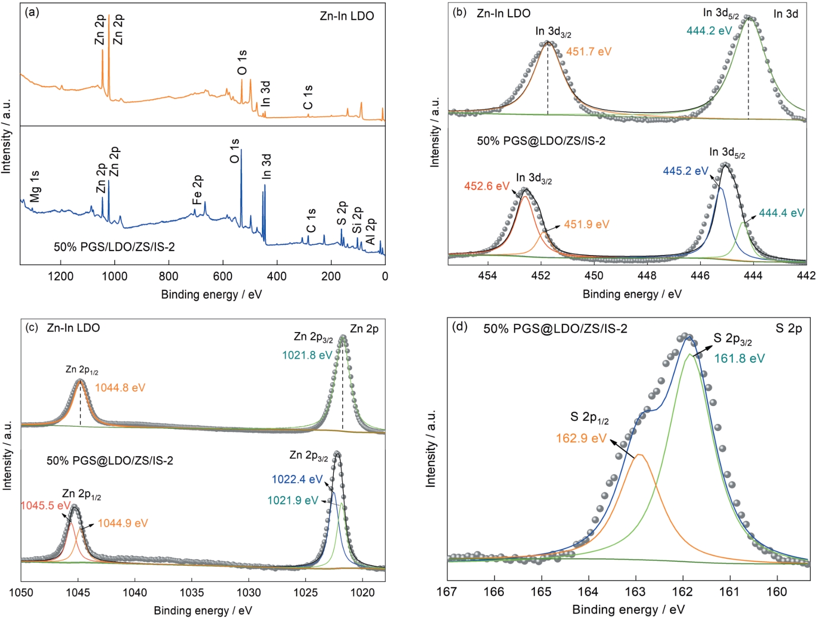 Fig.3 XPS survey spectra of Zn-In LDO and 50%PGS@LDO/ZS/IS-2 (a), high-resolution scans for In 3d (b), Zn 2p (c) and S 2p (d) electrons of Zn-In LDO and 50%PGS@LDO/ZS/IS-2 |