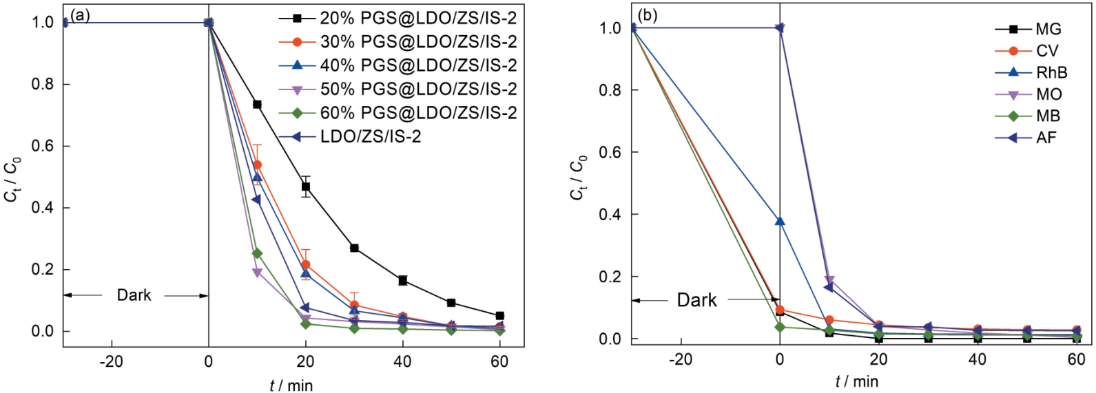 Fig.8 Effect of photocatalytic degradation for MO by different PGS@LDO/ZS/IS-2 (a) and photodegradation different dyes using 50%PGS@LDO/ZS/IS-2 (b) |