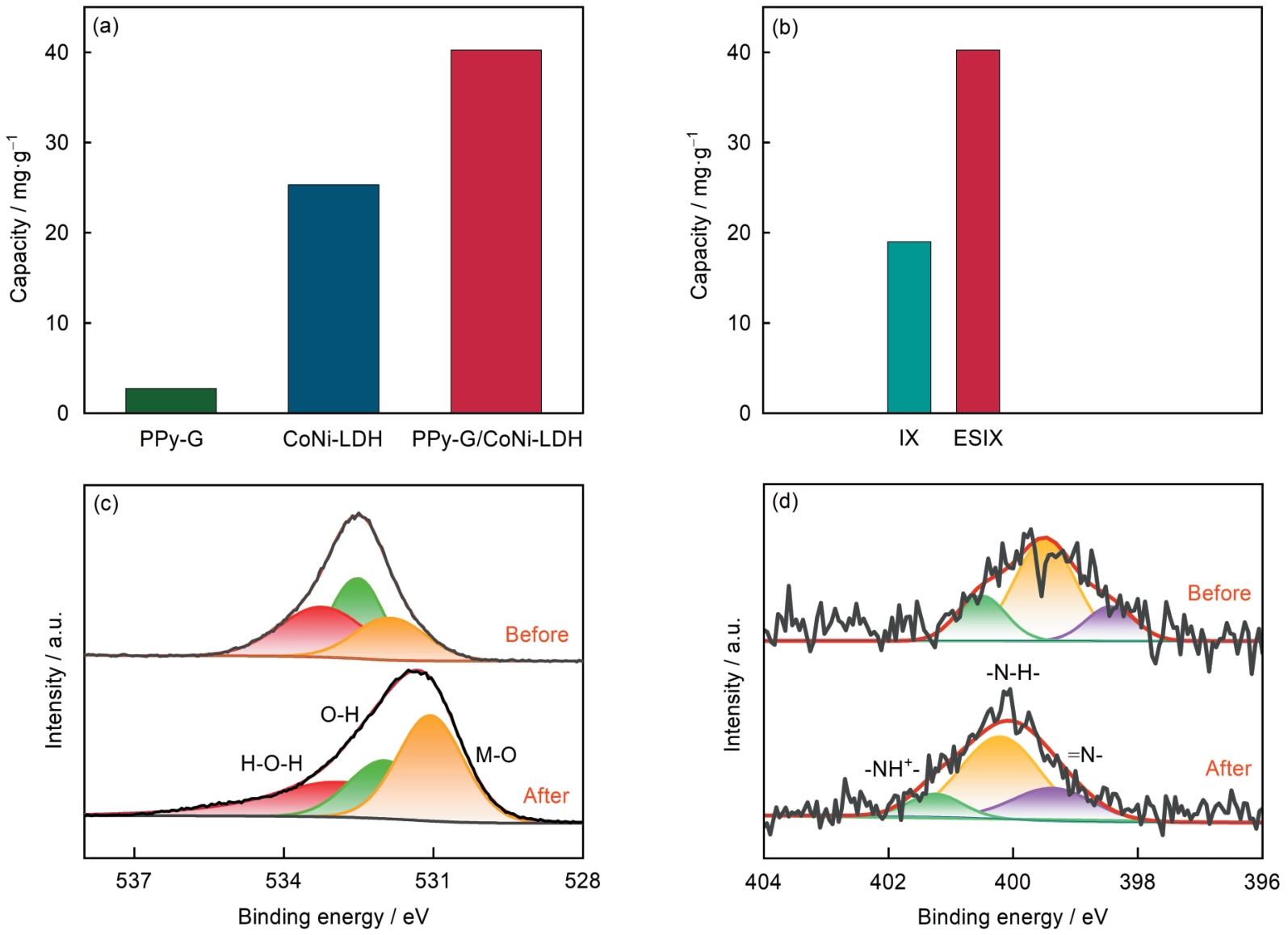 | Fig.11 Adsorption capacity of PPy-GO, CoNi-LDH and PPy-G/CoNi-LDH hybrid film (a), and PPy-G/CoNi-LDH hybrid film under different methods for phosphate ions (b) in 10 mg·L-1 PO |