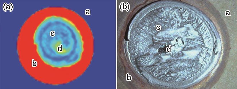 | Fig.2 Comparison between ultrasonic testing results of resistance spot welding joints and actual nuggets; (a) ultrasonic testing results; (b) actual nuggets |