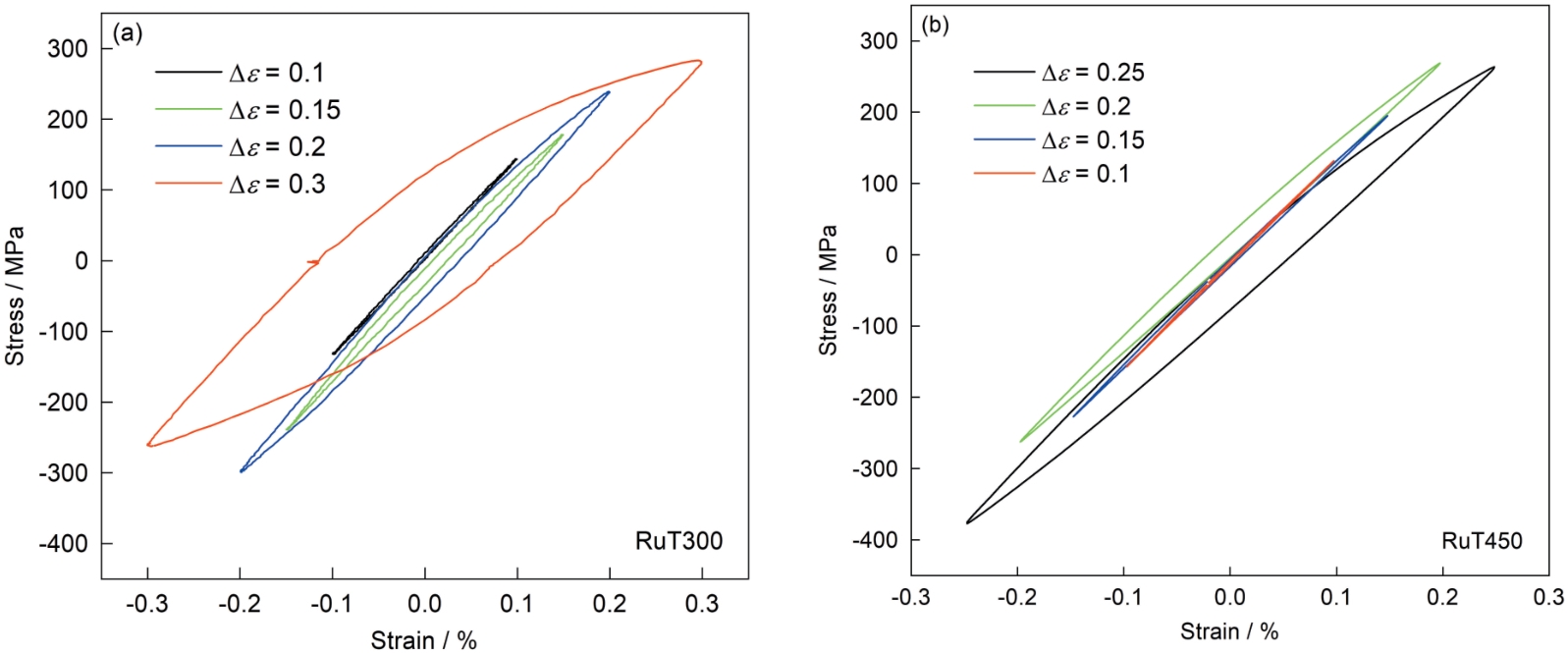 | Fig.9 Half life hysteresis loops of RuT450 (a) and RuT300 (b) under different strain amplitudes |