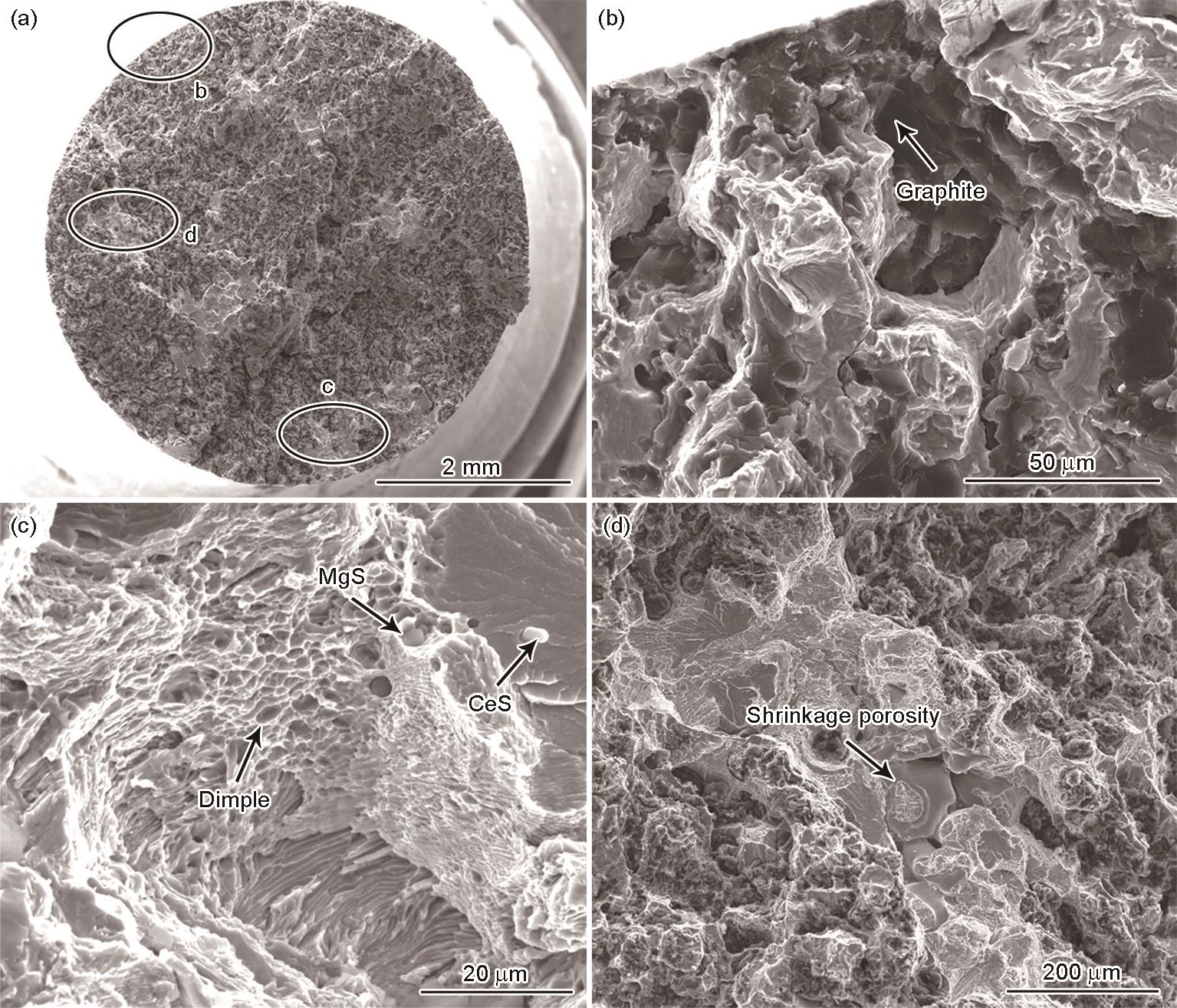 | Fig.10 Fatigue fracture morphologies of the RuT300 (εt = 0.3%, Nf = 569 cycles) (a) macroscopic morphology; (b~d) microscopic morphology at positions b, c and d |