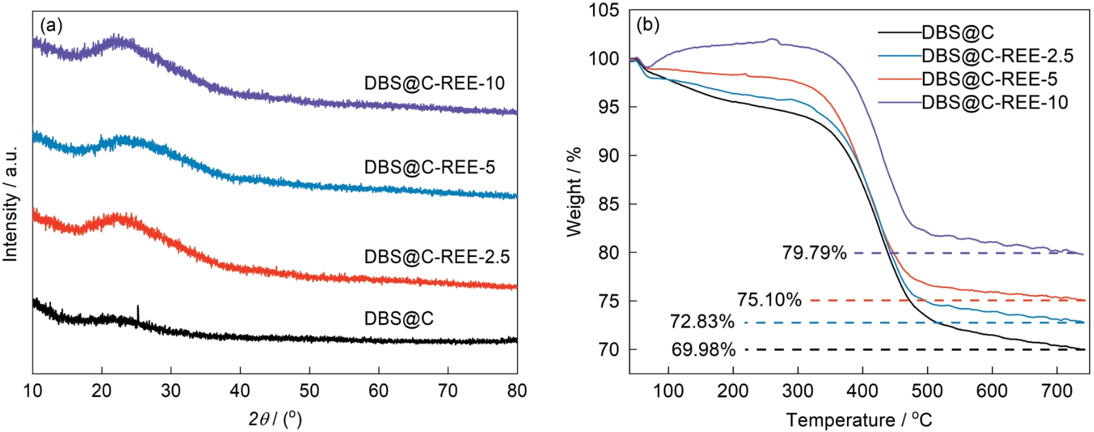 Fig.2 Characterization of composites with different rare earth content (a) XRD patterns, (b) TG curves |