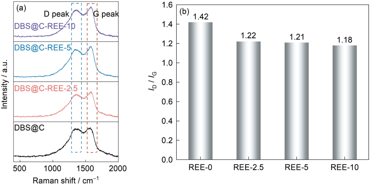 Fig.5 Raman of composites with different rare earth contents (a) Raman spectra, (b) ID/IG integration intensity ratio |