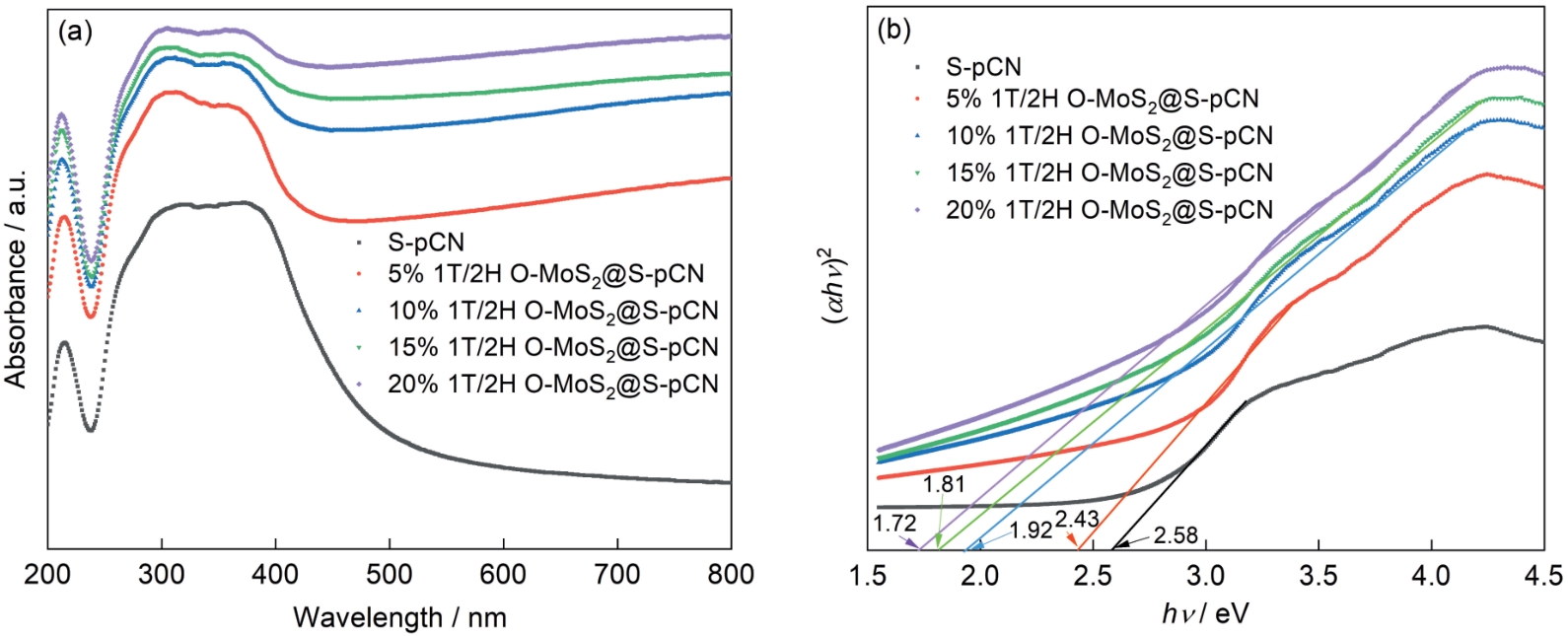 | Fig.6 UV-vis diffuse reflectance spectra (a) and Tauc plots (b) of S-pCN and 1T/2H O-MoS2@S-pCN |