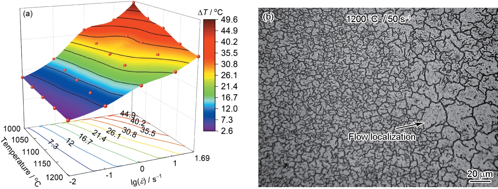 Fig.8 Microstructure diagram of temperature rise value of 9310 steel under different deformation conditions and 1200 oC/50 s-1 parameters under strain 1.2 (a) temperature rise under different deformation conditions, (b) microstructure at 1200 oC/50 s-1 parameters |
