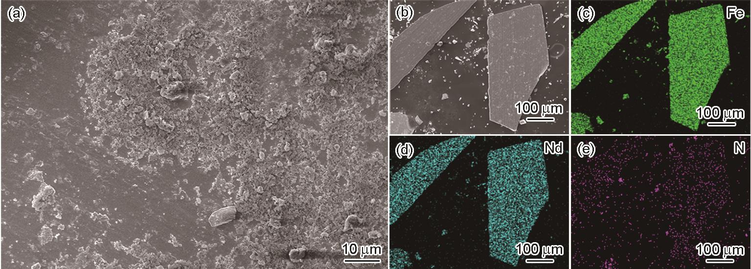 | 图1 喷涂0.6%BN磁粉表面的SEM、喷涂磁粉的区域以及Fe、Nd、N的EDS图 |