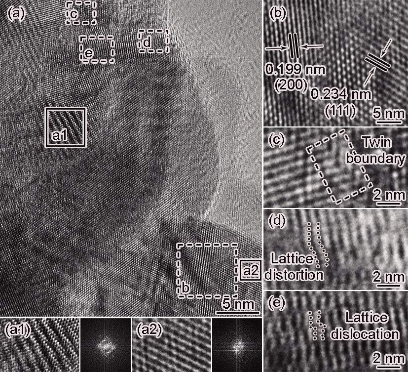 | Fig.4 HRTEM image of PdNSs (a) and FFTs from the solid boxes (a1, a2), magnification HRTEM images from the dashed boxes (b-e) |