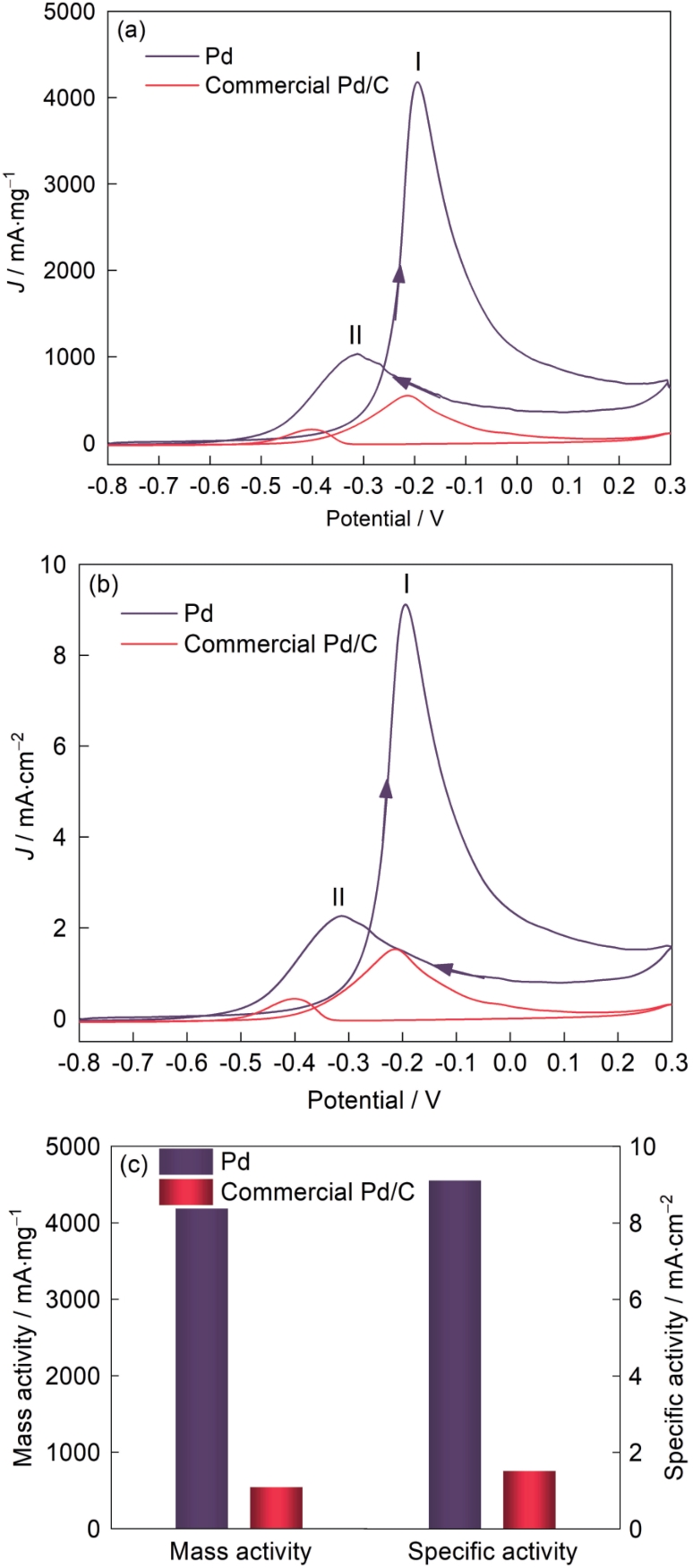 | Fig.8 Pd-mass (a) and ECSA (b) normalized CVs of the PdNSs and commercial Pd/C, and corres-ponding mass activities and specific activities of catalysts (c) (solution: 1 mol/L C3H8O3 + 1 mol/L KOH; scan rate: 50 mV/s) |