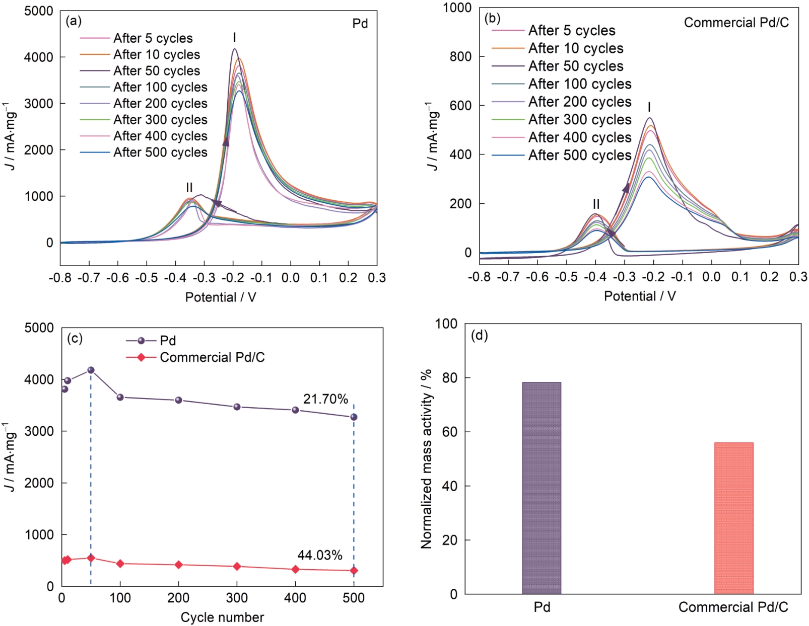 | Fig.9 CVs obtained before and after accelerated durability tests for PdNSs (a) and commercial Pd/C (b) for 500 cycles, durability properties of PdNSs and commercial Pd/C based on the onset peak current density for 500 cycles (c), normalized mass activity of catalysts after 500 cycles (d) (solution: 1 mol/L C3H8O3 + 1 mol/L KOH; scan rate: 50 mV/s) |