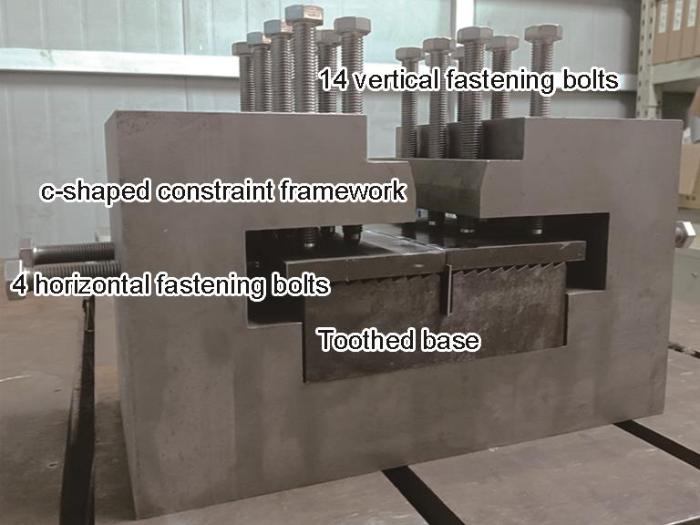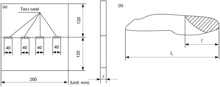 使用表1中编号为1δ、2δ和7δ的3种焊材,研究δ-铁素体含量对焊缝热裂纹敏感性的影响。依据GB/T 4675.4[15],进行压板对接焊接裂纹实验(FISCO实验),以评价3种焊材的热裂纹敏感性。母材为高SiN奥氏体不锈钢板,尺寸为200 mm × 120 mm × 12 mm。采用对接焊接,坡口的形状为I形。焊接前对钢板的待焊部位进行机械打磨以清理表面的铁锈和氧化层,再用丙酮和酒精清洗去除油污。FISCO实验装置如图2所示。将两块钢板放在齿形底座上,在坡口处插入特定尺寸的定位塞片以保证坡口间隙为1.5 mm。先将水平方向的螺栓紧固(共4个)顶住钢板,使坡口间隙不变以固定钢板的位置。然后用测力扳手将垂直方向的螺栓(共14个)紧固,给钢板施加垂直向下的作用力以防止焊接时钢板翘曲,测力扳手的扭矩为120 N·m。将钢板固定后进行焊接,焊接工艺参数为:电流:180 A;焊接速度:0.1 m/min;保护气体:99.999%氩气,气体流速:20 L/min。沿坡口依次进行四道次焊接,单道焊缝的长度约为40 mm,焊缝间距为10 mm,焊缝尾部的弧坑不填满,钢板的尺寸和焊接示意图如图3a所示。待焊件冷却至室温后将其取出,肉眼检查焊缝表面的裂纹情况。最后,使用折弯机将焊件沿焊缝方向弯断,观察断面裂纹并测量裂纹的长度,裂纹的示意图如图3b所示。裂纹率为