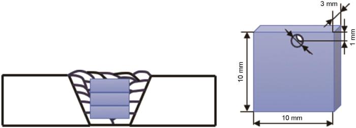 依据JB/T 7901-1999《金属材料实验室均匀腐蚀全浸试验方法》进行焊缝熔敷金属的浸泡腐蚀实验。用电火花切割机沿焊缝的纵向取样,每种焊缝金属取3个尺寸为10 mm × 10 mm × 3 mm的平行试样(图4)。用2000#砂纸将试样表面磨光后放入(球形瓶中)温度为95 ℃的6 mol/L硝酸溶液中分别连续浸泡240、480和720 h,在硝酸溶液中额外加入一定浓度的氧化性阳离子(1.70 g/L V5+、0.125 g/L Cr6+、2.06 g/L Ce4+),以模拟乏燃料的腐蚀环境。为了保证腐蚀实验的可靠性,硝酸溶液的体积与试样表面积之比大于20 mL/cm2。用SARTORIUS AG电子分析天平(精度0.1 mg)测量实验前后试样的质量,用质量损失法评估焊缝熔敷金属的平均腐蚀速率。用SUPRA 35扫描电子显微镜(SEM)观察腐蚀后试样表面的形貌。