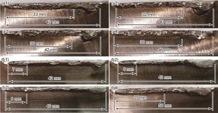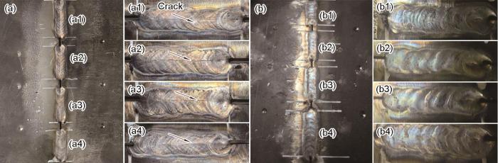 Macroscopic appearance of weld seam cross-section (a1-a4) 1δ, (b1-b4) 7δ
