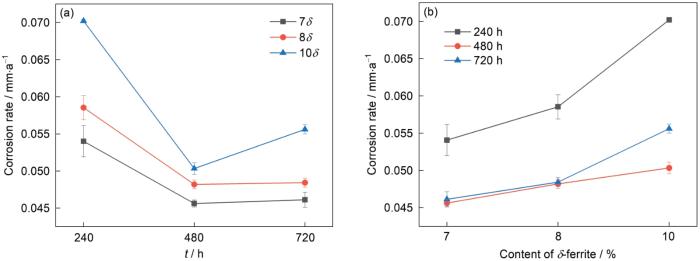 (3) 随着腐蚀时间的延长,δ-铁素体含量不同的焊缝金属的腐蚀速率都降低并趋于稳定,含量达到10%的δ-铁素体其腐蚀极易沿着铁素体网蔓延并使腐蚀速率稍有提高。