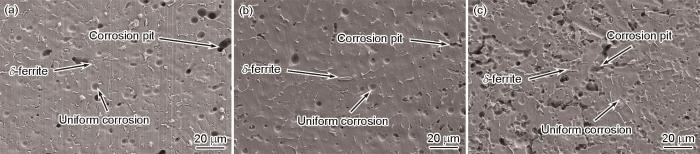 腐蚀10 d试样的表面形貌,如图10所示。可以看出,所有试样表面的腐蚀坑均发生在δ-铁素体上,可见焊缝金属的耐蚀性与δ-铁素体有较大的关系。