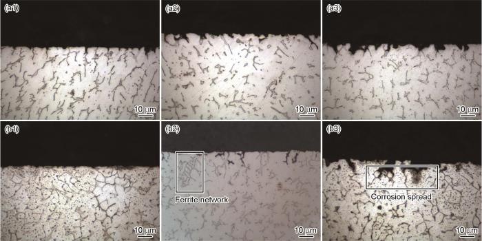 如图8b所示,3种焊缝金属腐蚀10 d的腐蚀速率远高于后期的腐蚀速率。其原因是,在腐蚀的初期金属表面的钝化膜尚未生成,焊缝金属的质量损失过大。随着腐蚀的进行,在7δ和8δ试样表面逐渐生成钝化膜,使腐蚀速率逐渐降低并趋于稳定,如图8b所示。但是10δ试样的情况异常,与腐蚀20 d相比,腐蚀30 d后其腐蚀速率提高。图12给出了8δ和10δ试样腐蚀不同时间后纵截面的金相照片。可以看出,随着腐蚀时间的延长试样表面的腐蚀严重,沿着δ-铁素体方向的腐蚀更深,但是奥氏体组织的腐蚀仍然较轻。8δ试样的腐蚀情况表明,熔敷金属内的δ-铁素体均匀分布,随着腐蚀时间的延长腐蚀表面始终有残存的δ-铁素体,表明熔敷金属整体的腐蚀速率在30 d后达到了平衡。对于δ-铁素体含量过高(如10δ试样)的试样,大量的δ-铁素体在熔敷金属内形成铁素体网,如图12b2所示。可以看出,一方面铁素体分割了奥氏体组织和细化了晶粒,使焊缝不易开裂,但是腐蚀极易在熔敷金属内部沿着铁素体网蔓延而增大了铁素体的暴露面积,也使腐蚀30 d后的腐蚀速率稍有提高。