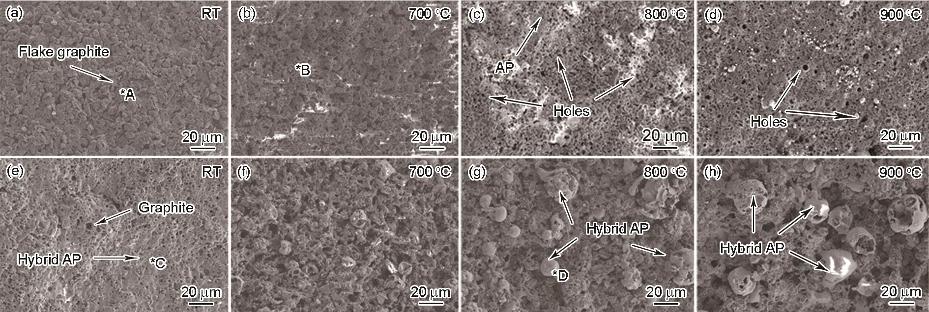 图3 AP涂层和杂化AP涂层在不同温度下的SEM图像 |