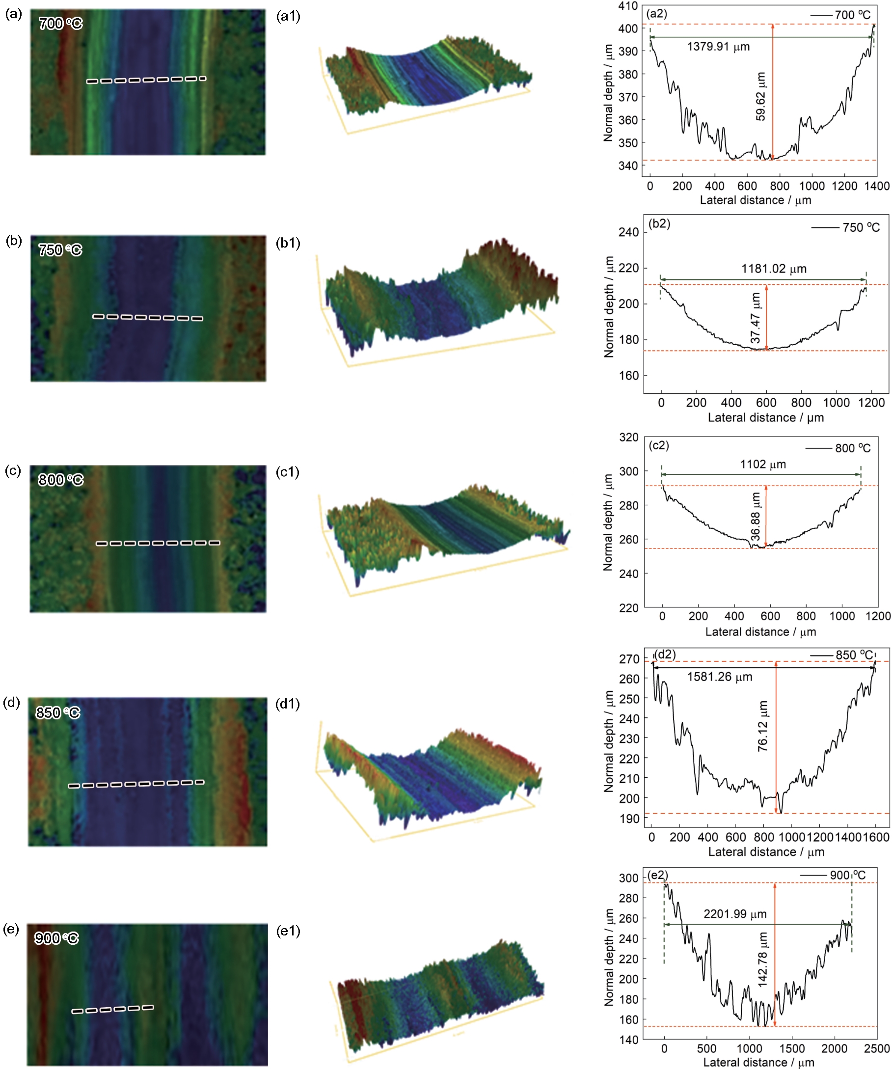 Fig.5 Wear mark surfaces of TA1 discs at different temperatures for AP-bonded coatings were analyzed using wear tracks (a-e), 3D contour maps (a1-e1), and 2D height profile curves (a2-e2) |