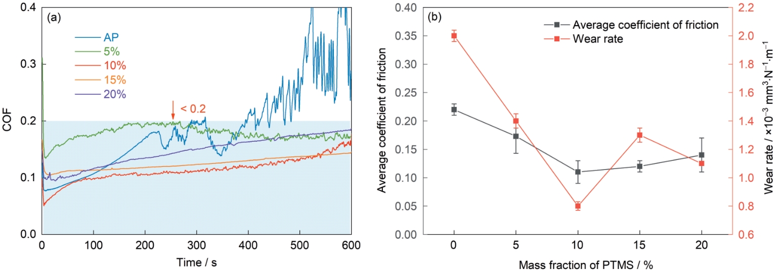 | Fig.7 Friction curves (a), average friction coefficient and wear rate (b) of coatings with different PTMS contents at 800 °C |