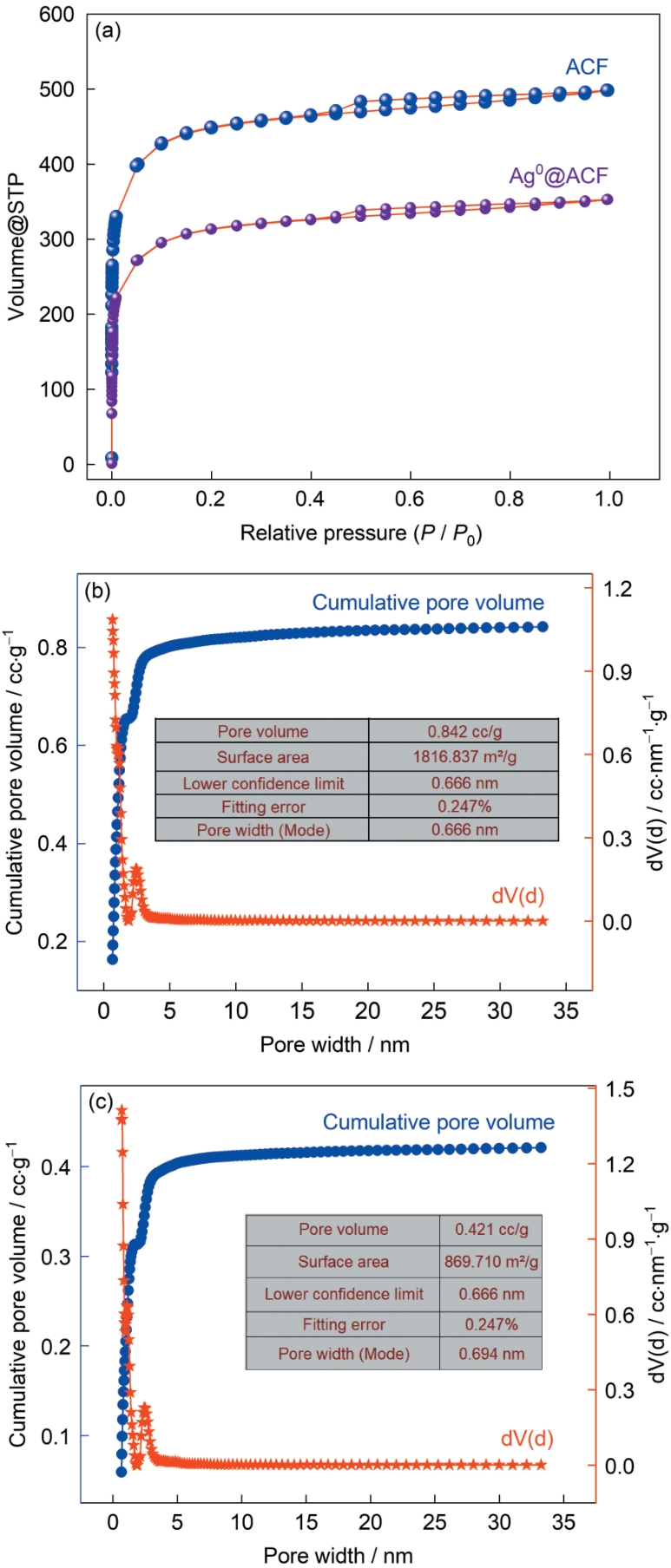Fig.4 N2 adsorption and desorption curves (a), pore size distribution of ACF (b) and 5%Ag0@ACF (c) |