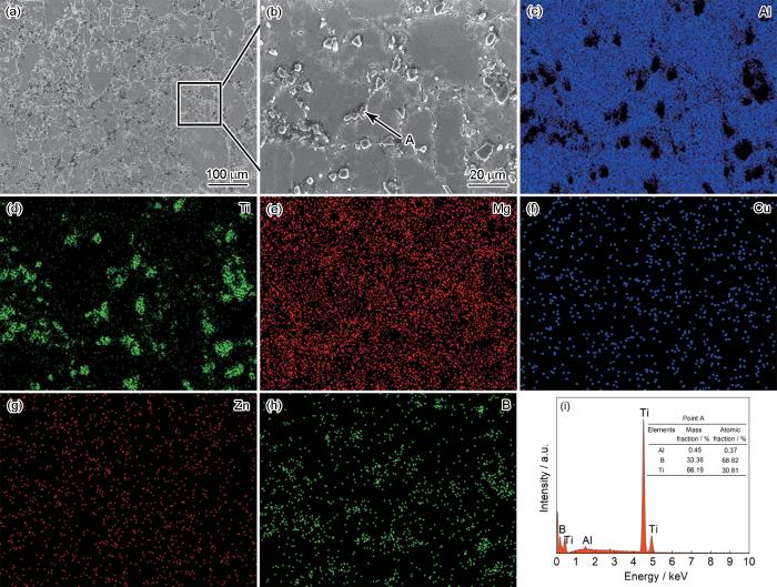 SEM (a, b) and Al (c), Ti (d), Mg (e), Cu (f), Zn (g), B (h) element distribution of hot-pressed 7075-6%TiB2 composites and EDS analysis of point A in Fig.5b (i)