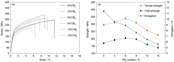 Tensile stress-strain curves (a) and mechanical properties (b) of hot-pressed 7075-xTiB2 (x = 0%, 3%, 6%, 9%, 12%, 15%) composites