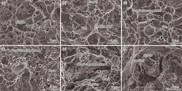 图11给出了在不同温度固溶的7075-6%TiB2复合材料的断口形貌。在460 ℃固溶的复合材料,在其断口出现大量韧窝和撕裂棱,表明在拉伸过程中发生了剧烈的塑性变形,断裂机制主要为韧性断裂。在480 ℃固溶时,在断口出现大量的撕裂棱和解理面。在500 ℃固溶的复合材料,在其断口准解理面增多甚至出现微裂纹,且凹凸状态加剧。在固溶温度为520 ℃的复合材料的断口出现大裂纹、孔洞,主要是TiB2颗粒团聚导致的穿晶断裂,表明其断裂机制主要是脆性断裂。