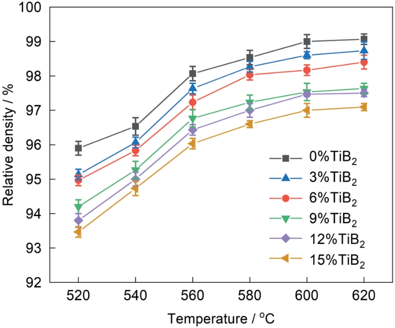 图1 7075-xTiB2 (x = 0%, 3%, 6%, 9%, 12%, 15%)复合材料的致密度与热压烧结温度的关系 |