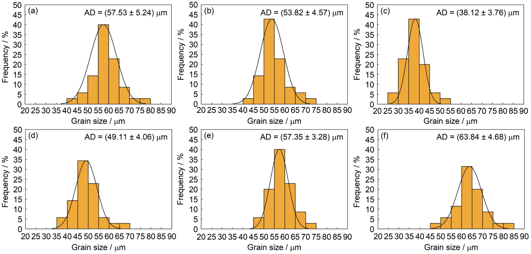 Fig.4 Histograms of grain size distribution in hot pressed 7075-xTiB2 composites (a) x = 0%, (b) x = 3%, (c) x = 6%, (d) x = 9%, (e) x = 12%, (f) x = 15% |